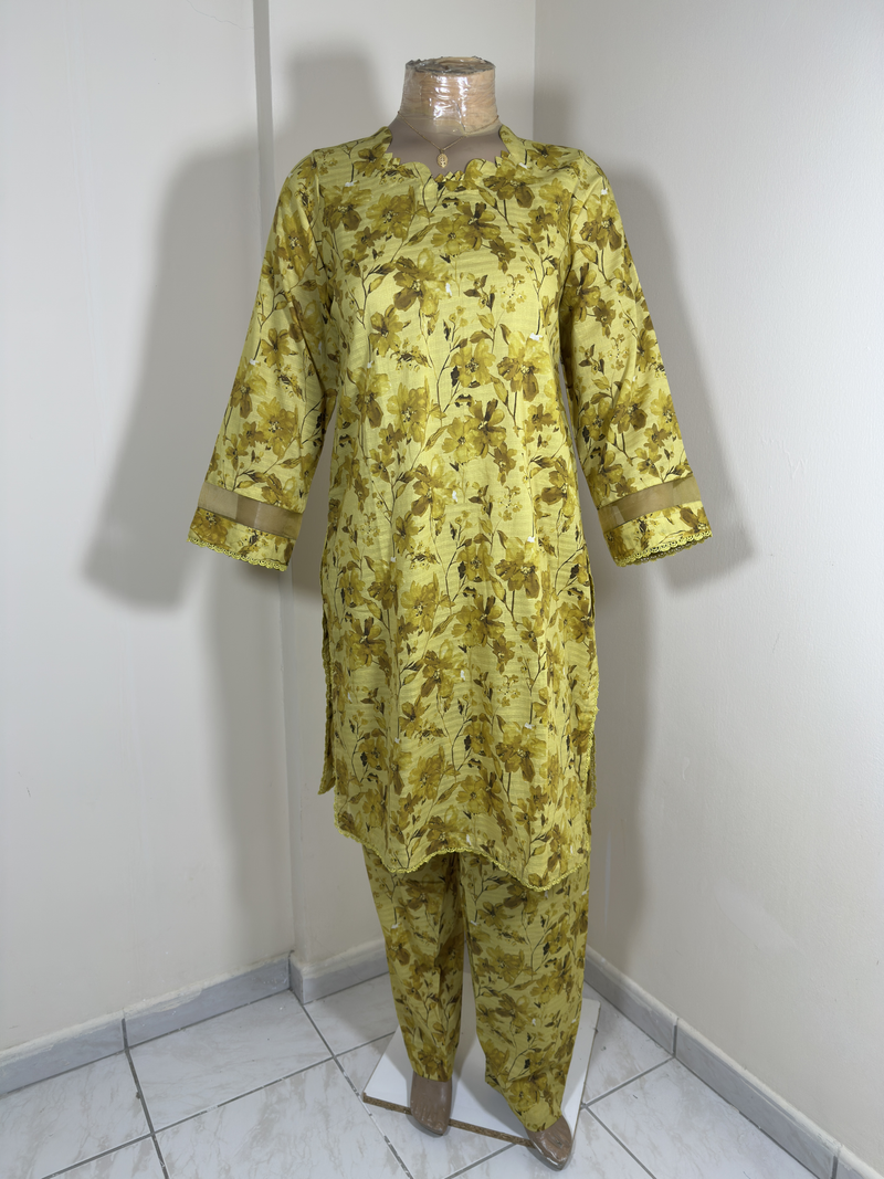 2-Piece Stitched Suit – Mustard Light and Brown Flower Shirt with Mustard Organza and All-Over Trousers
