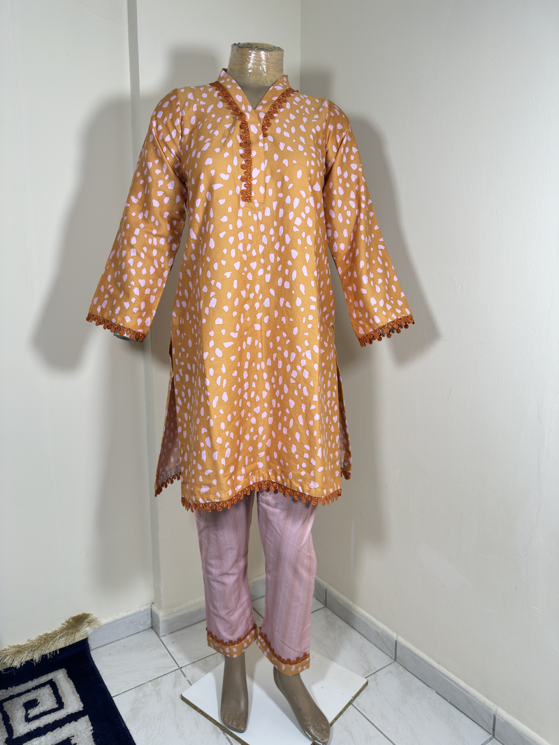 2-Piece Stitched Suit – Mustard & Pink Random Dots Shirt with Pink Trousers