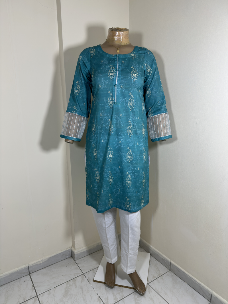 2-Piece Stitched Suit – Sea Green Shirt & White Trousers