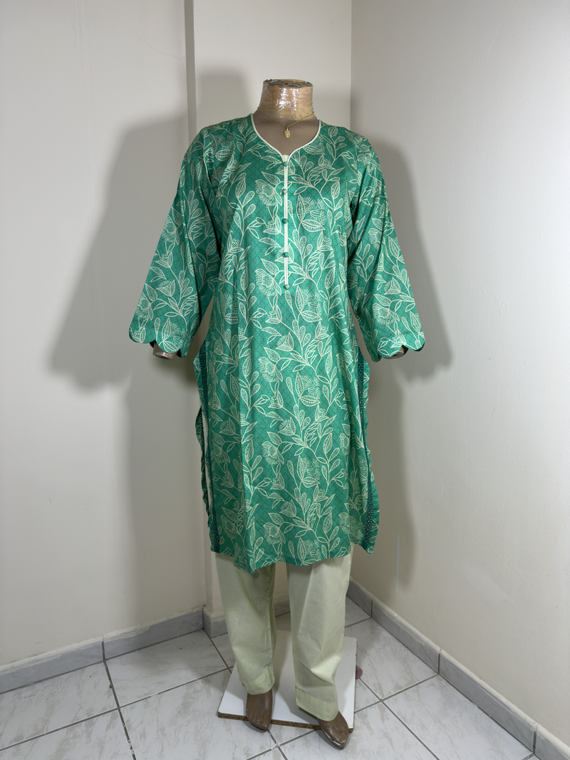 2-Piece Stitched Suit – Sea Green Shirt with Cream Flowers & Trousers