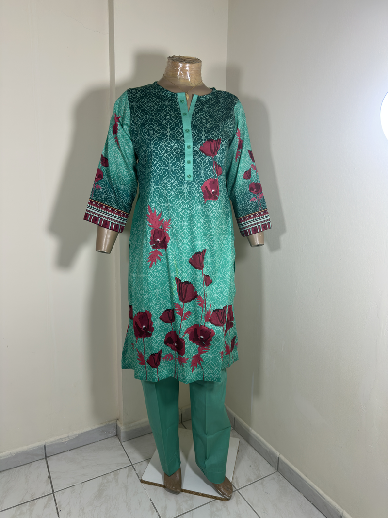 2-Piece Stitched Suit – Sea Green Shirt with Meroon Flowers & Sea Green Trousers
