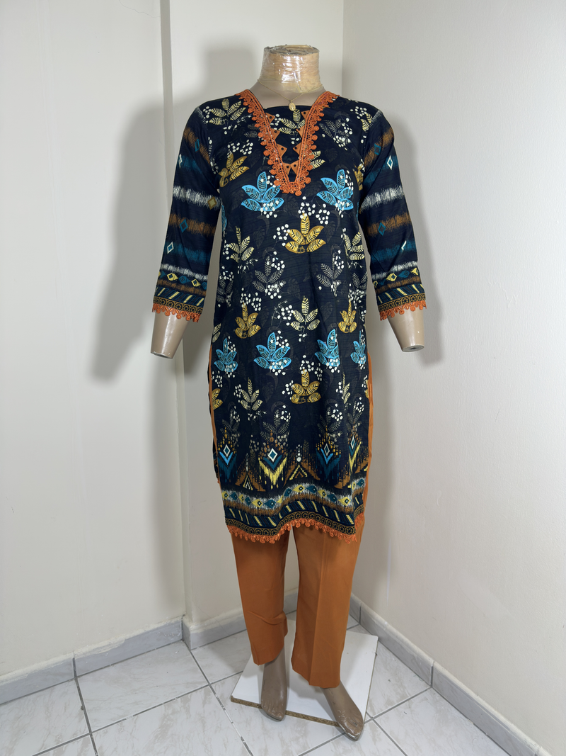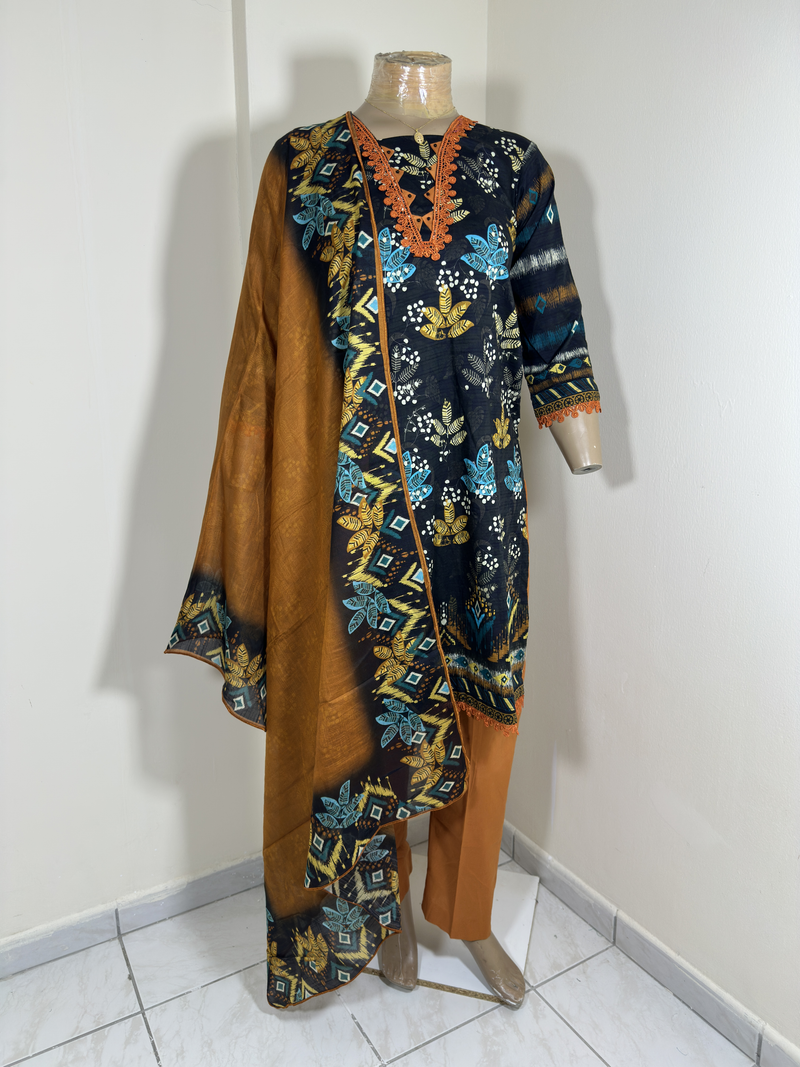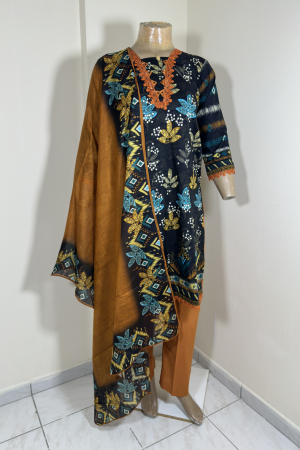 3-Piece Stitched Suit – Black Shirt & Brown Trousers & Dupatta